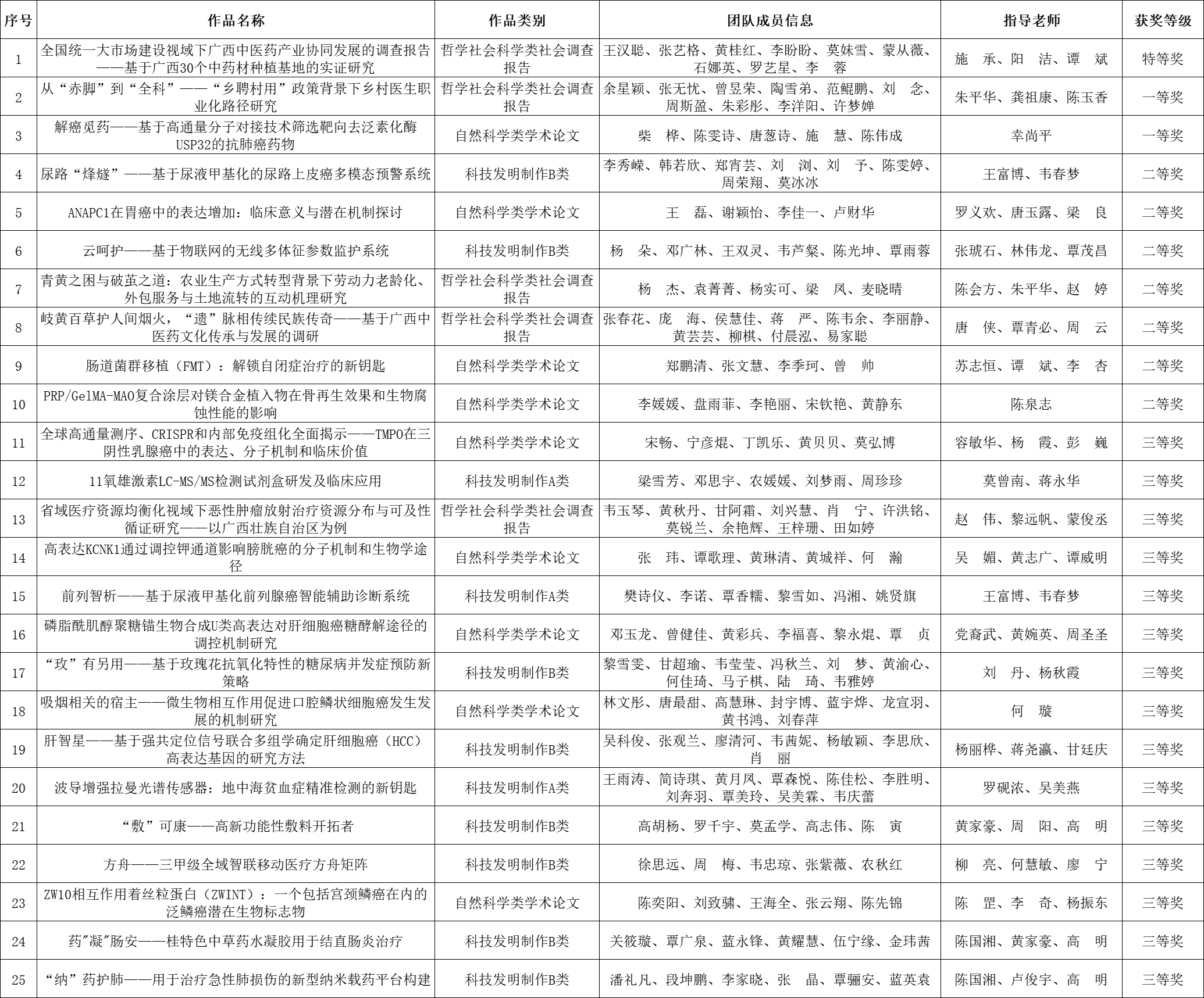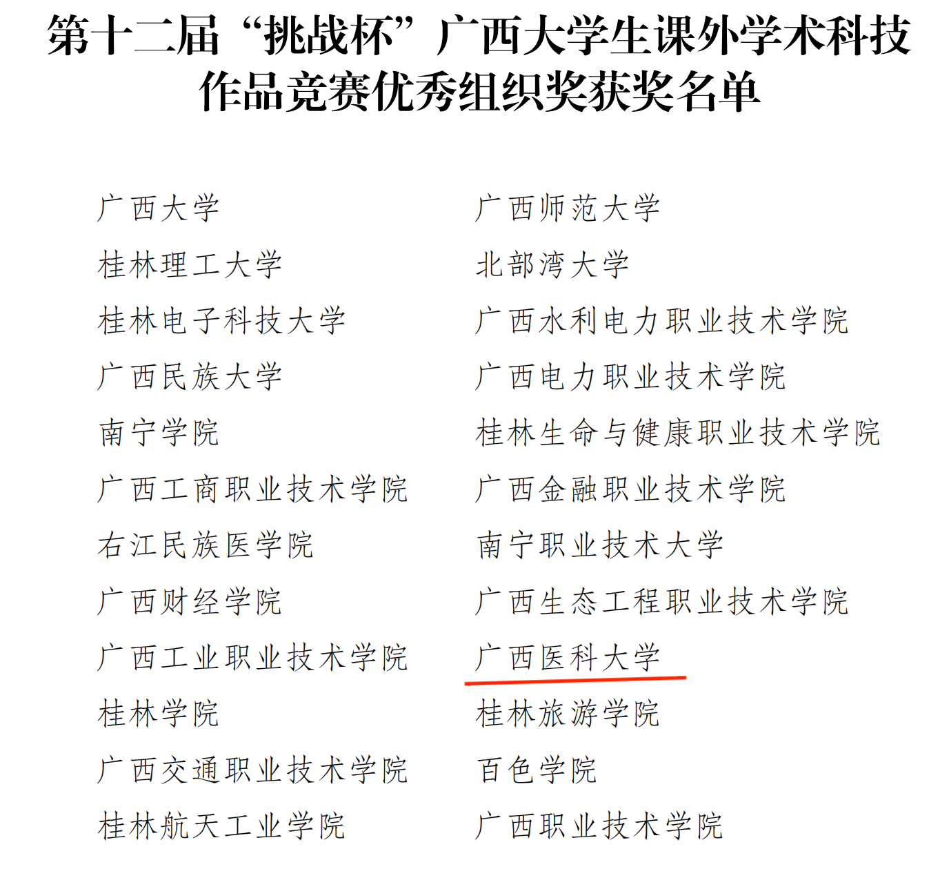近日,第十二届“挑战杯”广西大学生课外学术科技作品竞赛获奖名单正式公布,我校师生团队在激烈的竞争中荣获佳绩,获特等奖1项,一等奖2项,二等奖6项,三等奖16项,其中1项作品入围第十九届“挑战杯”全国大学生课外学术科技作品竞赛,学校获优秀组织奖。