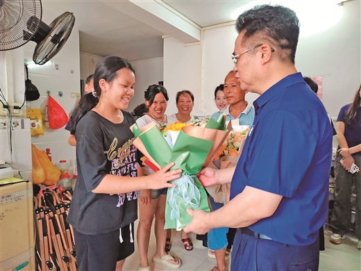 广西医科大学校长曾志羽将录取通知书和鲜花送到陆思凤手中。 南国早报记者 周隆富摄