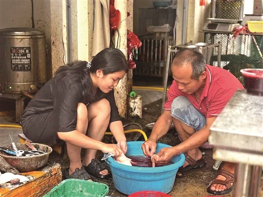 7月31日中午,广西医科大学校长一行返程后,思凤又和二叔二婶一起来到活禽摊干活。“之前我没杀过鸡,现在我也不敢,怕杀不好顾客会不满意。”思凤说,她主要是给二叔和二婶打下手,拔拔毛去去内脏。由于不习惯戴手套干活,思凤的双手长时间接触温水,已经开始有死皮脱落,“这有什么,二叔二婶更辛苦呢!”