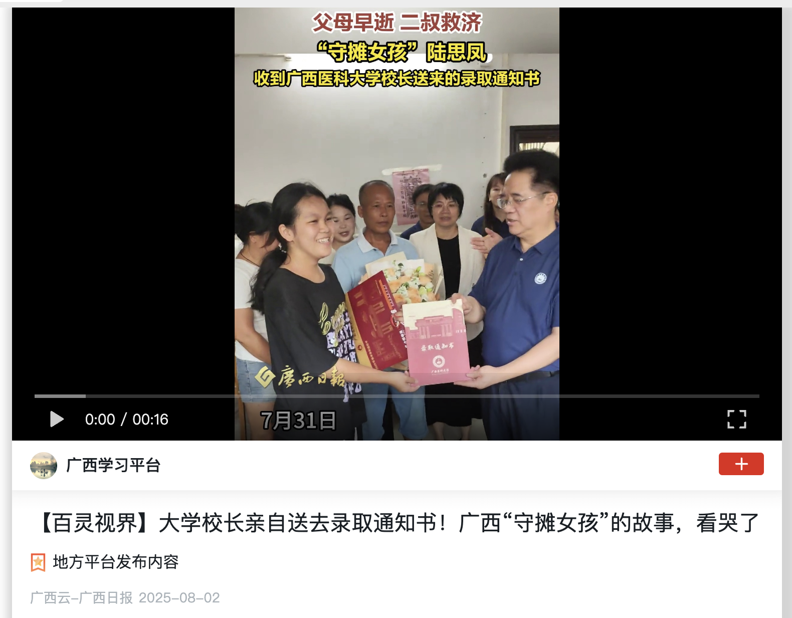近日,新华社、光明日报、广西日报、南国早报等媒体关注我校曾志羽校长一行于7月31日赶赴防城港市上思县,将满载着希望与关怀的2025年首封本科新生录取通知书,亲手送到了“守摊女孩”陆思凤同学家中,为她逆境成才的励志故事增添了温暖注脚。后续,陆思凤同学的励志故事也被多家媒体持续跟踪报道,相关新闻、短视频等累计13条。
