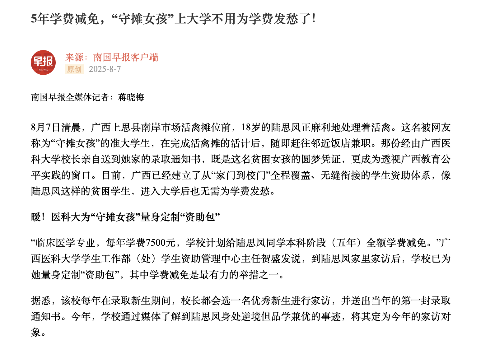 8月7日清晨,广西上思县南岸市场活禽摊位前,18岁的陆思凤正麻利地处理着活禽。这名被网友称为“守摊女孩”的准大学生,在完成活禽摊的活计后,随即赶往邻近饭店兼职。那份经由广西医科大学校长亲自送到她家的录取通知书,既是这名贫困女孩的圆梦凭证,更成为透视广西教育公平实践的窗口。目前,广西已经建立了从“家门到校门”全程覆盖、无缝衔接的学生资助体系,像陆思凤这样的贫困学生,进入大学后也无需为学费发愁。