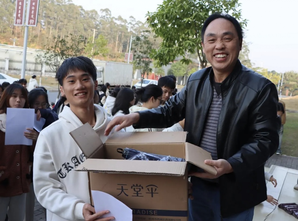 广西医科大学给家庭经济困难新生发放爱心大礼包。